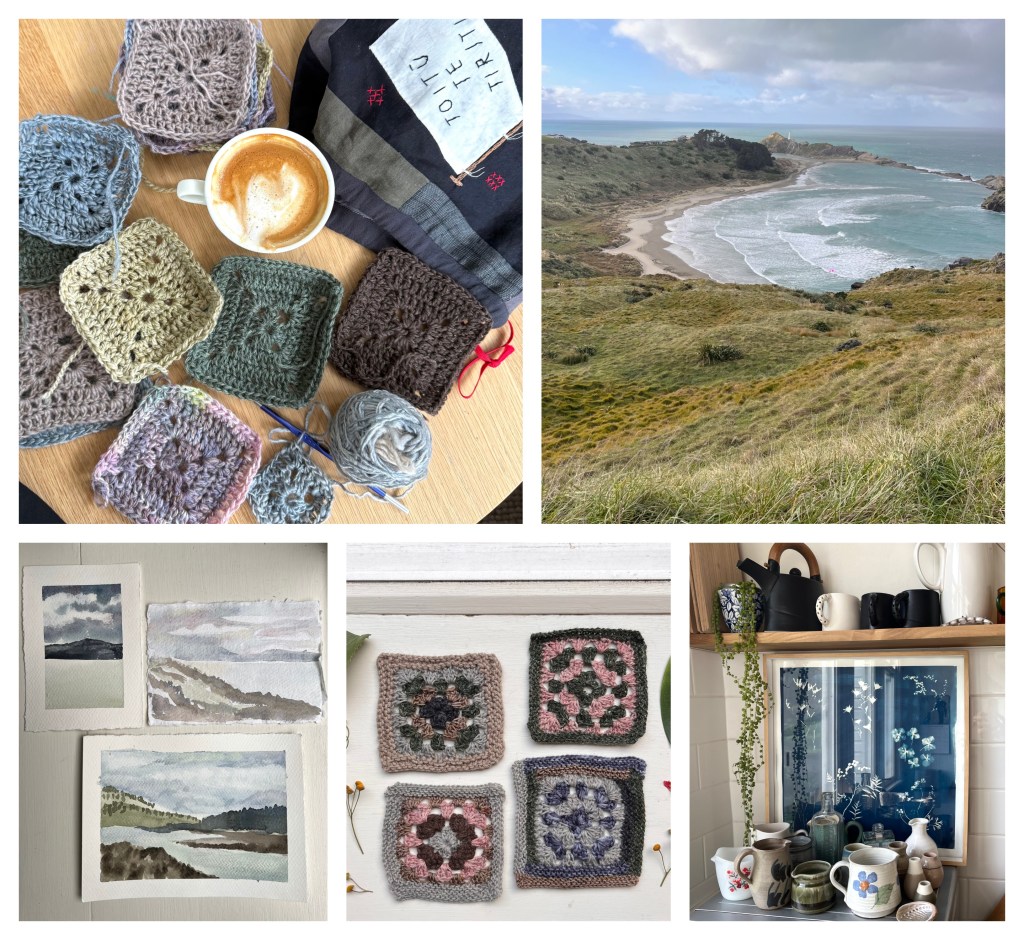 Other things I've been doing lately: reading – I revisited some favourite Janet Frame stories around her 100th birthday, which was in August, and have been enjoying the latest Elizabeth Strout novel this week – I can't remember what I read in between! Sewing – I have made a few items of clothing, including some square-neck tops from silk fabric, the pattern for which I cut from a store-bought top I love. And also some patchwork tote bags, to use up small pieces of linen and cotton in pleasing colours. I sewed up the patchwork pieces and then stitched the finished block onto the front of an existing tote bag, to hide the logo on it. And painting – my love for watercolour paints continues! I am still practising my skies and seas specifically.